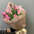Монобукет из пионовидных роз Кахала и лимониума в нежной упаковке