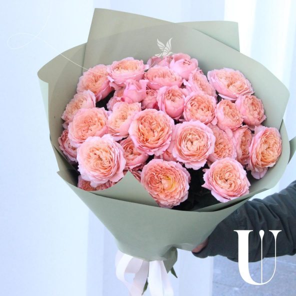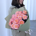 Букет из кустовых пионовидных роз сорта Джульетта в дизайнерской упаковке