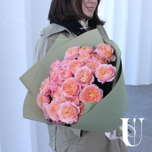 Монобукет из пионовидных роз Мандарин Экспрешн в оливковой упаковке