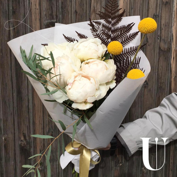 Букет с ароматными белыми пионами, солнечной краспедией, стабилизированным папоротником и эвкалиптом.