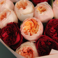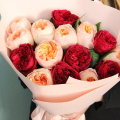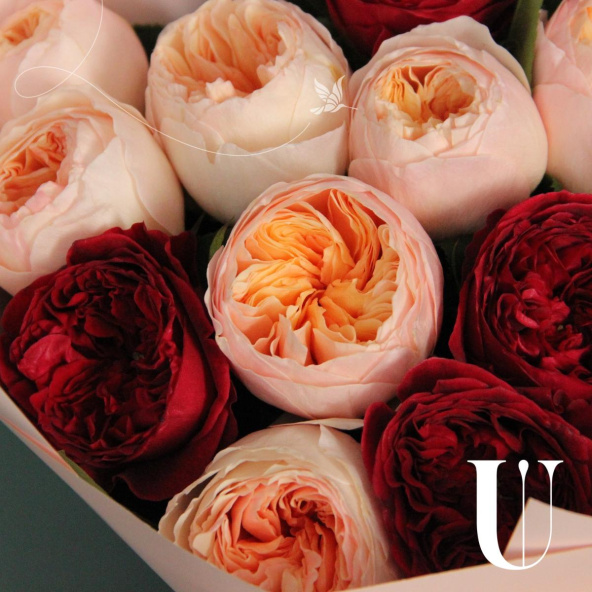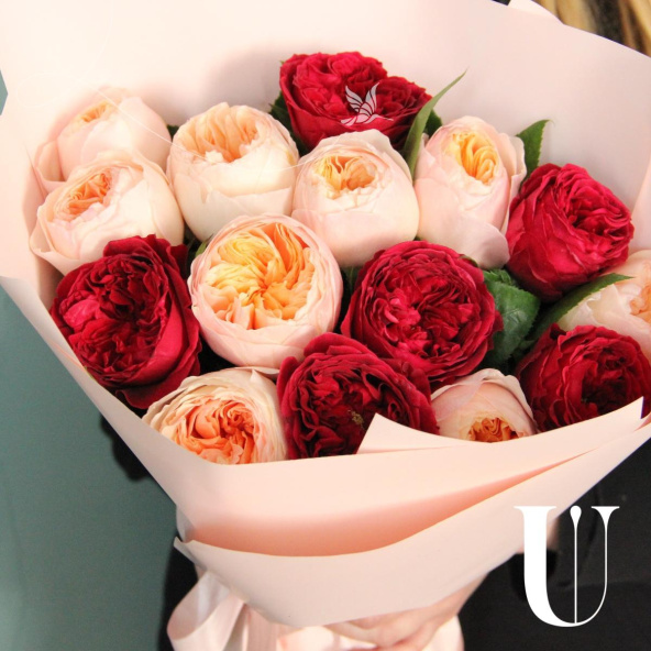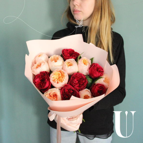 Букет из 15 английских пионовидных роз в лаконичной упаковке