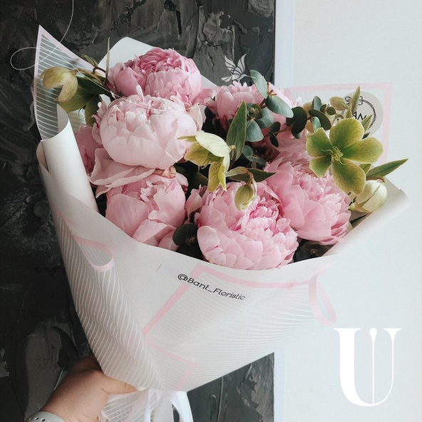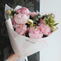 - 9 пионов нежно-розового оттенка, зелень. Упаковка - корейская пленка