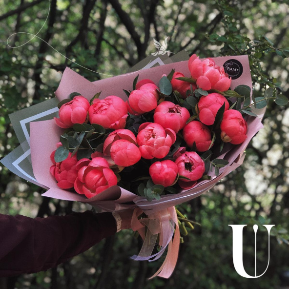 - 15 коралловых пионов, эвкалипт. Упаковка - корейская пленка