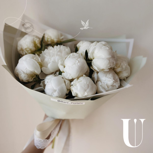 - 11 пионов молочного оттенка. Упаковка - корейская пленка