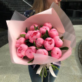 Монобукет из малиновых роз и оранжевого лагуруса в упаковке