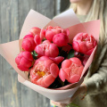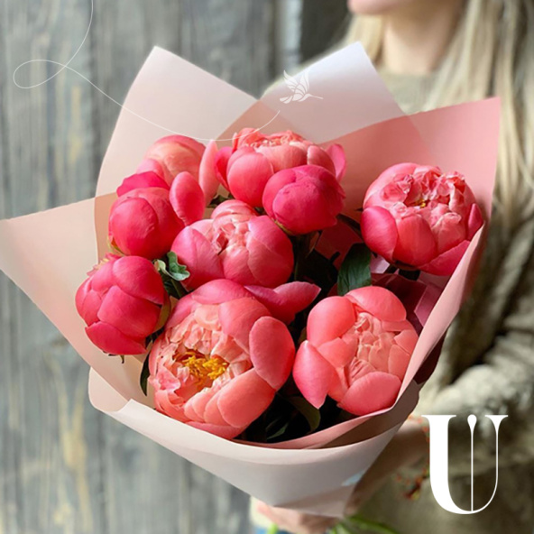 Пионы коралловые 9шт., упаковка матовая пленка 2 цвета, лента атласная.