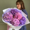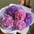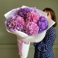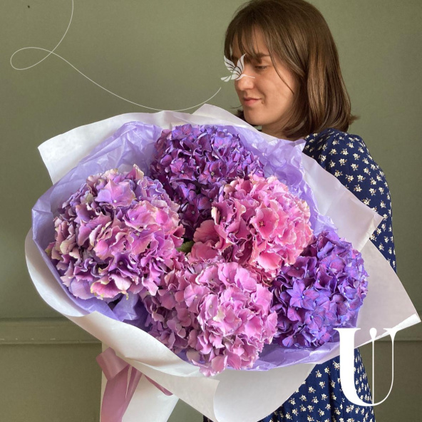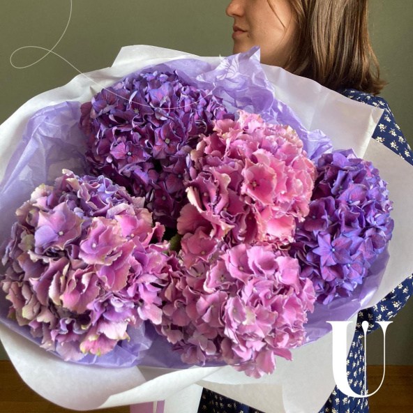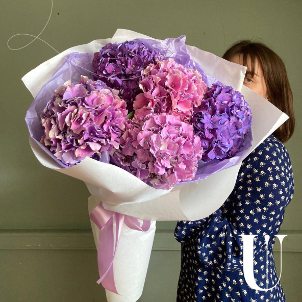 Моно букет из пяти роскошных акварельных гортензий в лаконичной упаковке