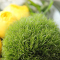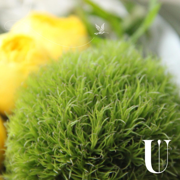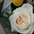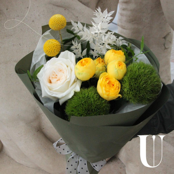 - Солнечный букет с пионовидными розами, диантусом, краспедией, стабилизированным рускусом и фисташкой