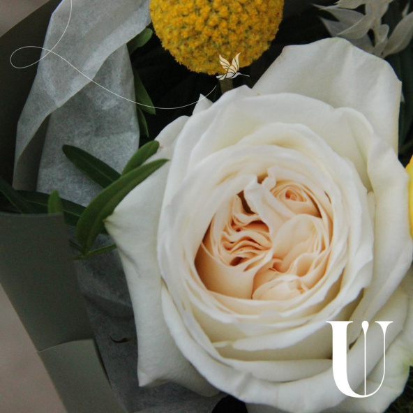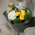 - В составе: Роза пионовидная кустовая 1 шт, Роза пионовидная 1 шт, диантус 2 шт, краспедия 2 шт, рускус стабилизированный 1 шт, фисташка 1 шт, упаковка и лента