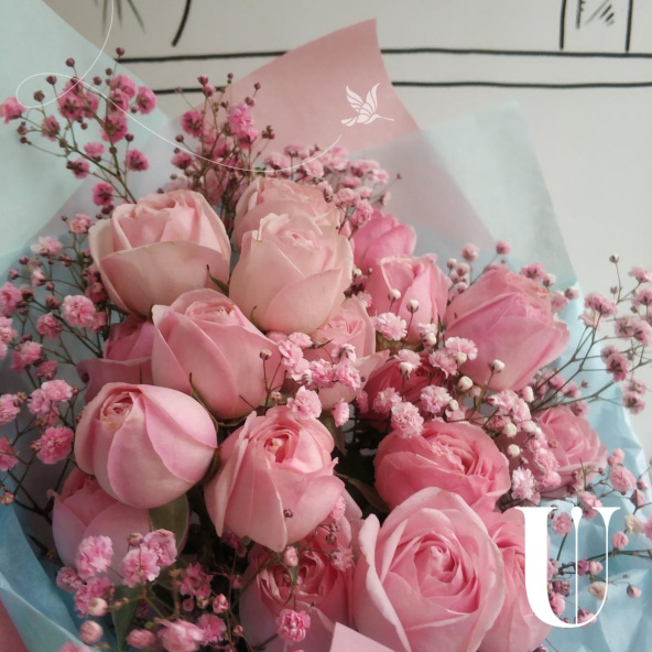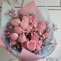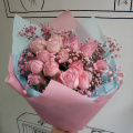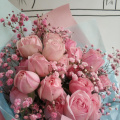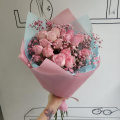 Монобукет из 7 розовых диантусов и эвкалипта в упаковке