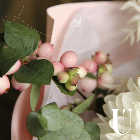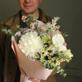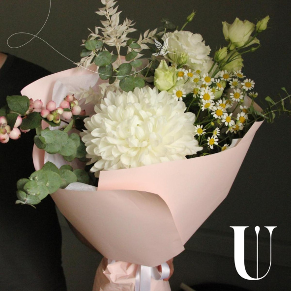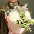 Состав : хризантема сортовая 1, лизиантус 1, ромашка кустовая 2, снежноягодник 1, эвкалипт 3, рускус стабилизированный 1