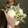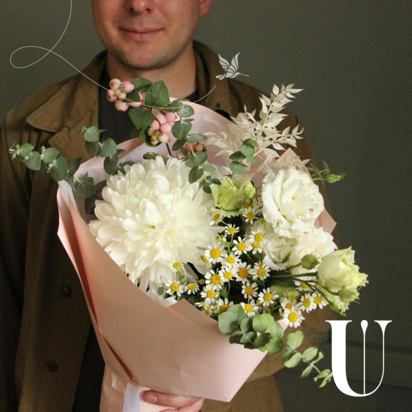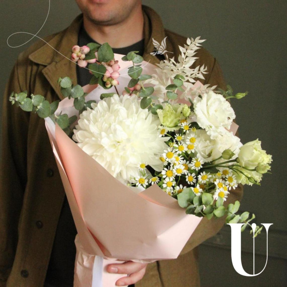Букет с ромашками, сортовой хризантемой, лизиантусом, снежноягодником, рускусом и ароматным эвкалиптом