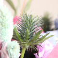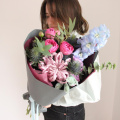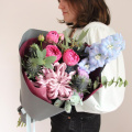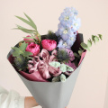Букет с эрингиумом, канареечником, сортовой хризантемой, дельфиниумом, розой и эвкалиптом