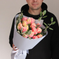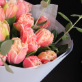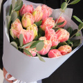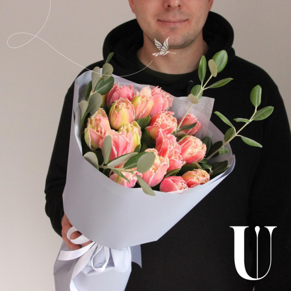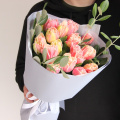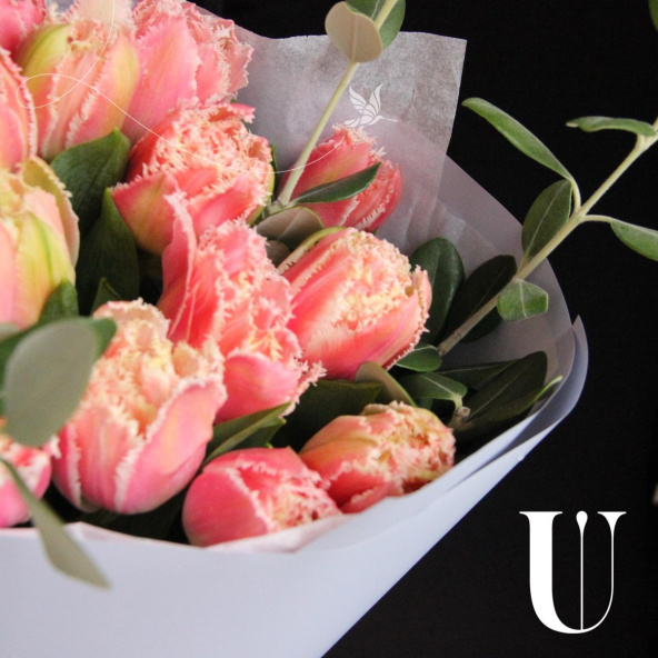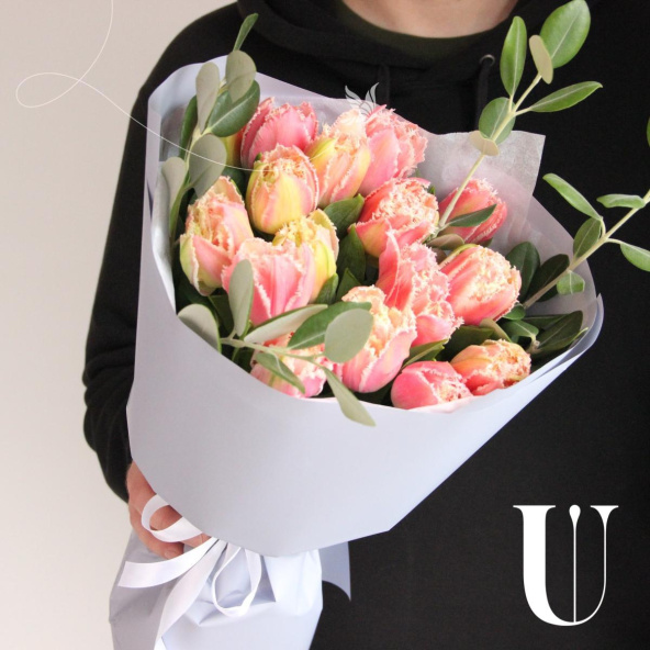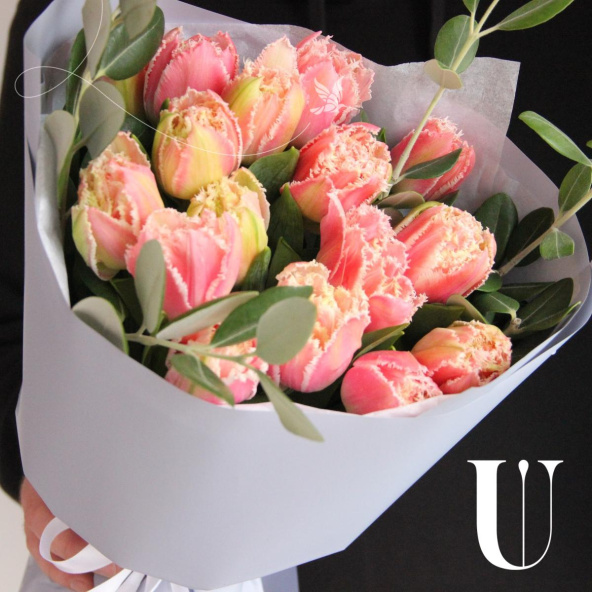 Моно букет из пятнадцати кружевных тюльпанов с веточками питтоспорума в лаконичной упаковке