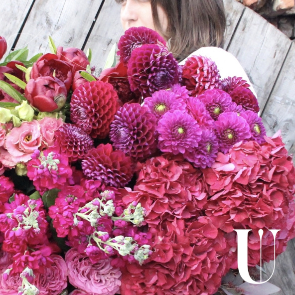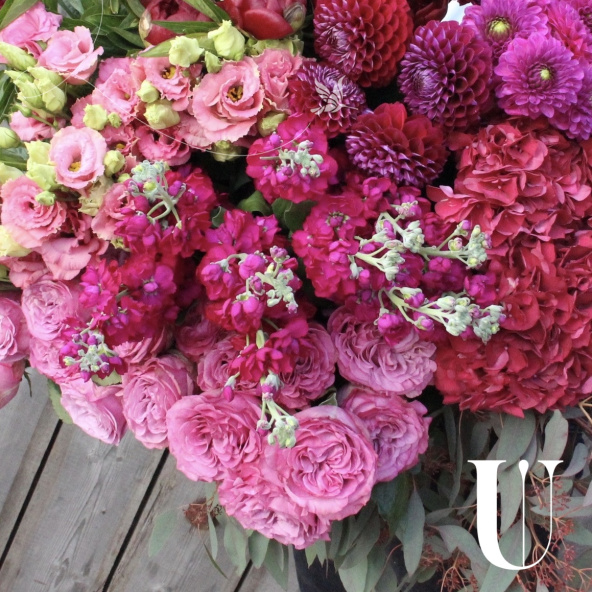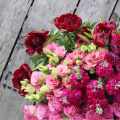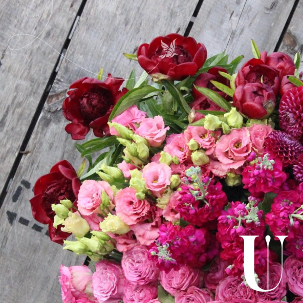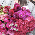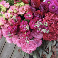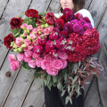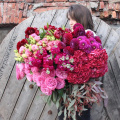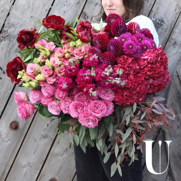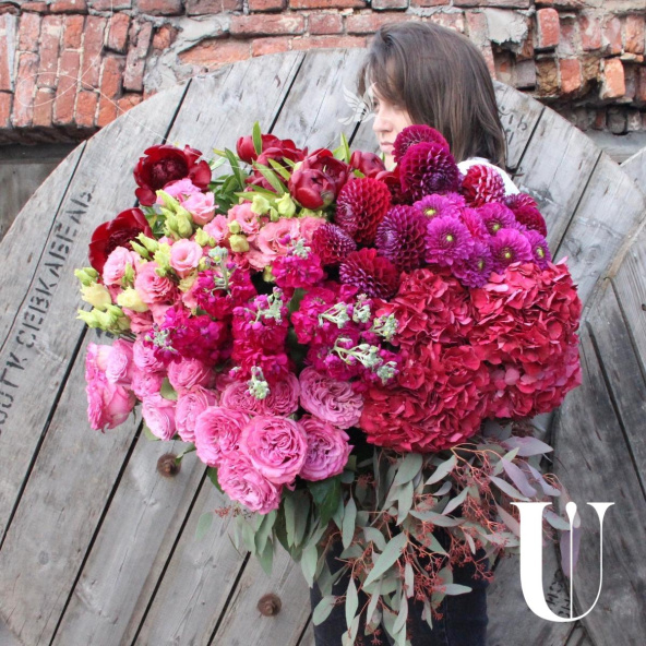 В составе: 15 пионовидных роз, 10 пионов, 15 маттиол, 5 гортензий, 15 лизиантусов, пучок эвкалипта, 20 георгин