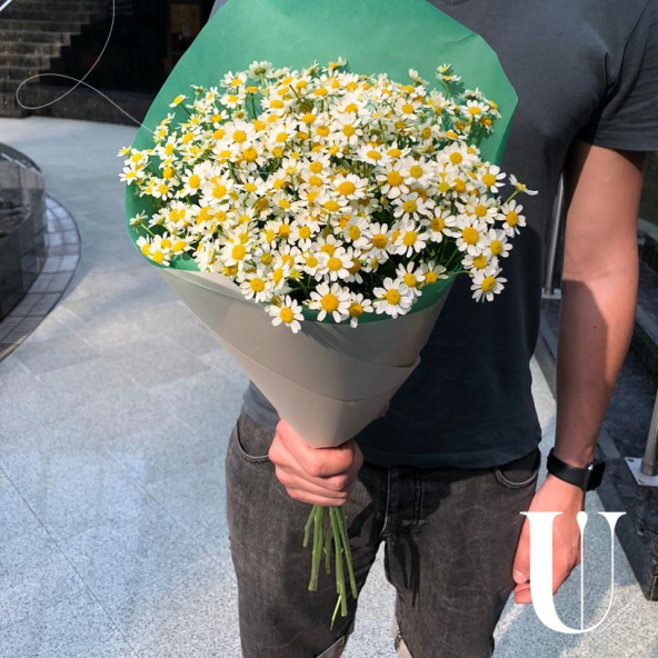 Монобукет из белых кустовых хризантем и розовой нигеллы в розовой упаковке