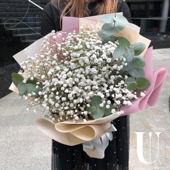 Монобукет из белых кустовых хризантем и розовой нигеллы в розовой упаковке