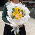 Монобукет из 5 роз сорта Вайт Охара и лимониума в упаковке