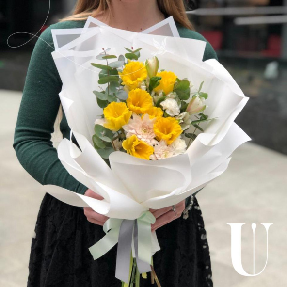 Монобукет из белых кустовых хризантем в дизайнерской упаковке