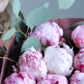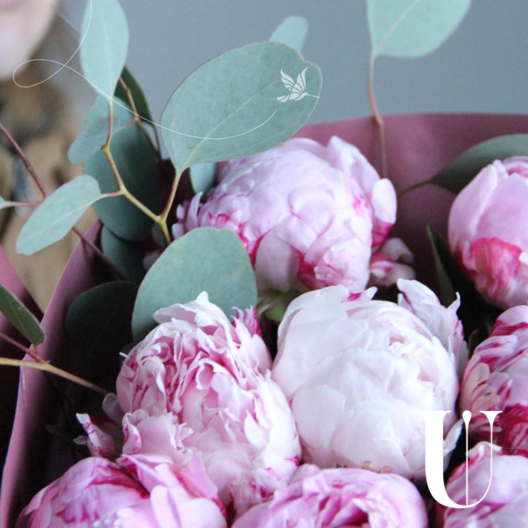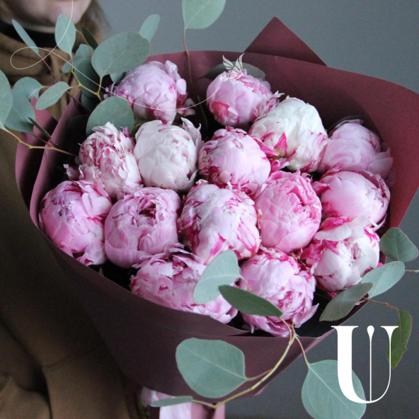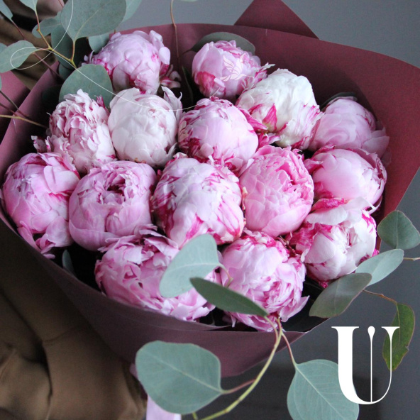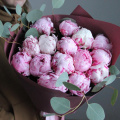 Нежный моно букет из 15 пионов с веточками эвкалипта, в лаконичной упаковке