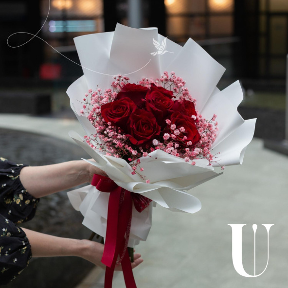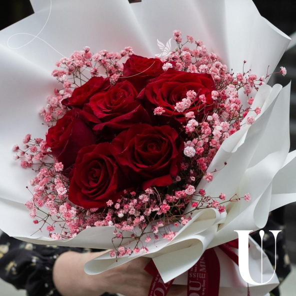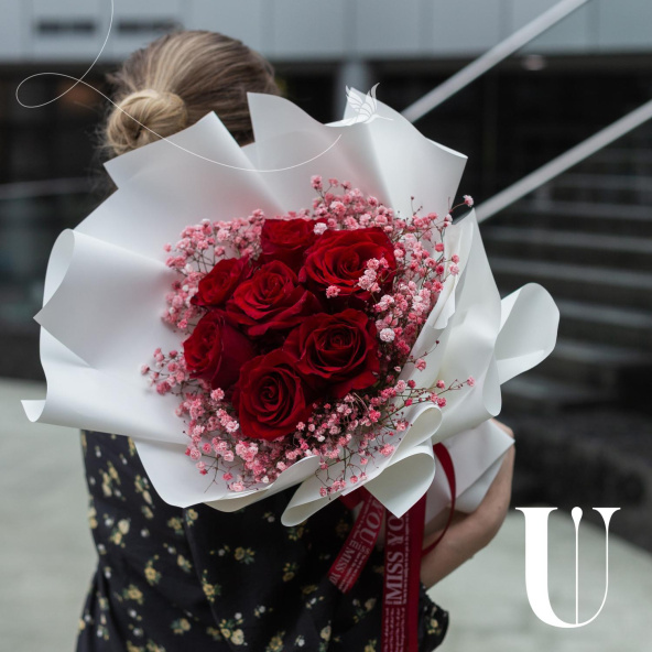 Монобукет из 5 роз сорта Мондиаль в дизайнерской упаковке