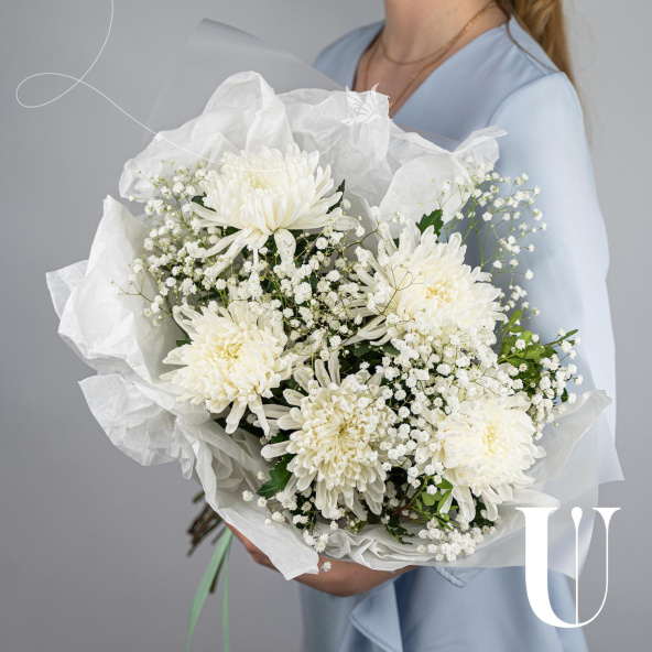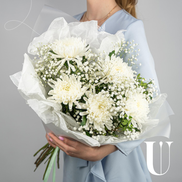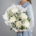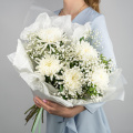 Монобукет из белых ирисов и ромашки в стильной упаковке