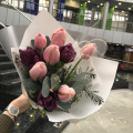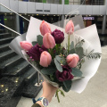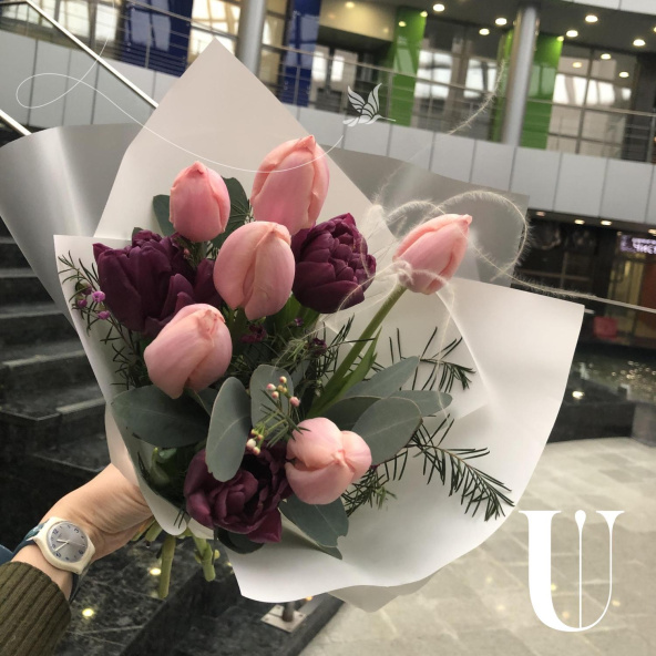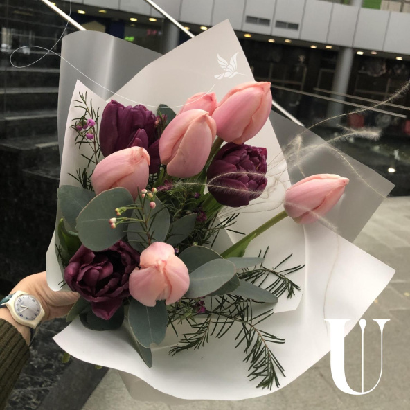 Тюльпан пионовидный - 3, тюльпан - 6, эвкалипт - 1, хамелациум - 1