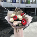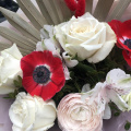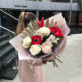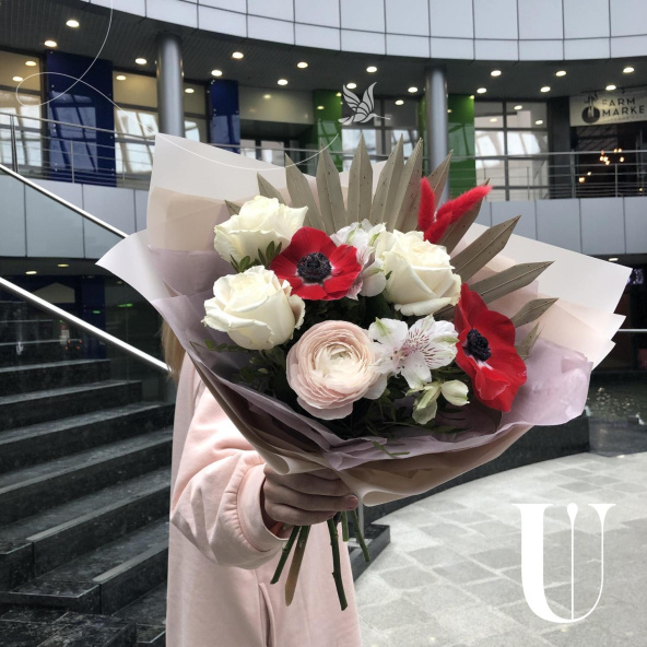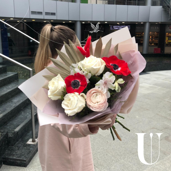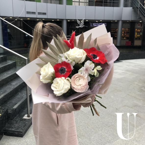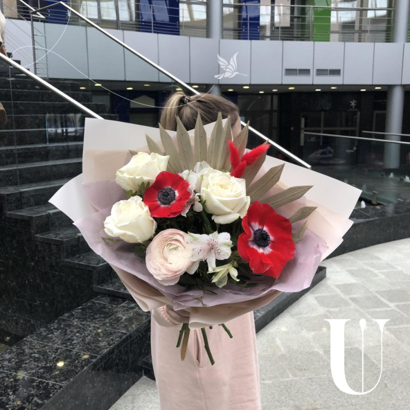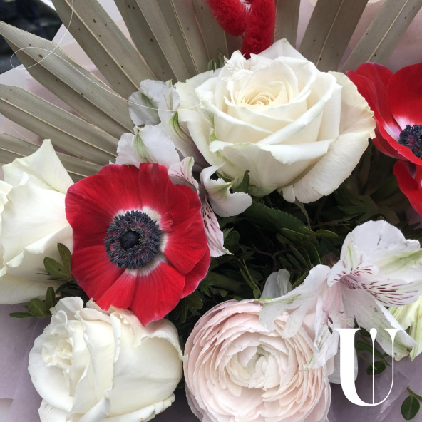 Анемон - 2, Ранункулюс - 1, Роза Плая бланка - 3, Альстромерия - 1, Пальма - 1, Фисташка - 1