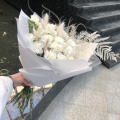 Букет из белых кустовых хризантем и розовых диантусов в упаковке