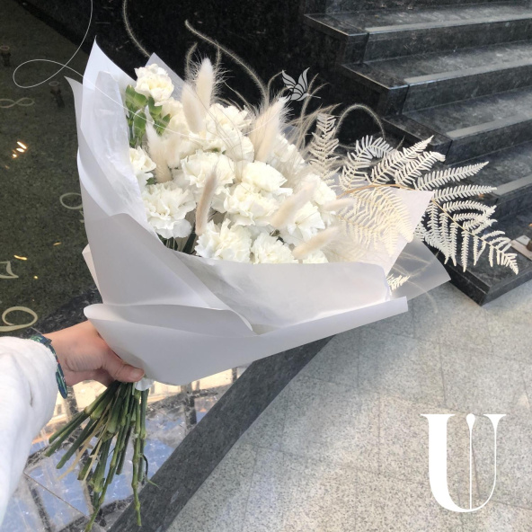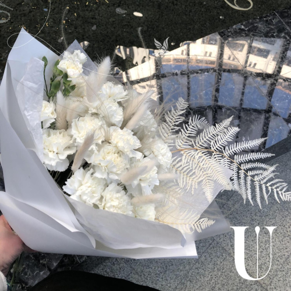 Монобукет из нежных и розовых диантусов в белой упаковке
