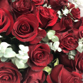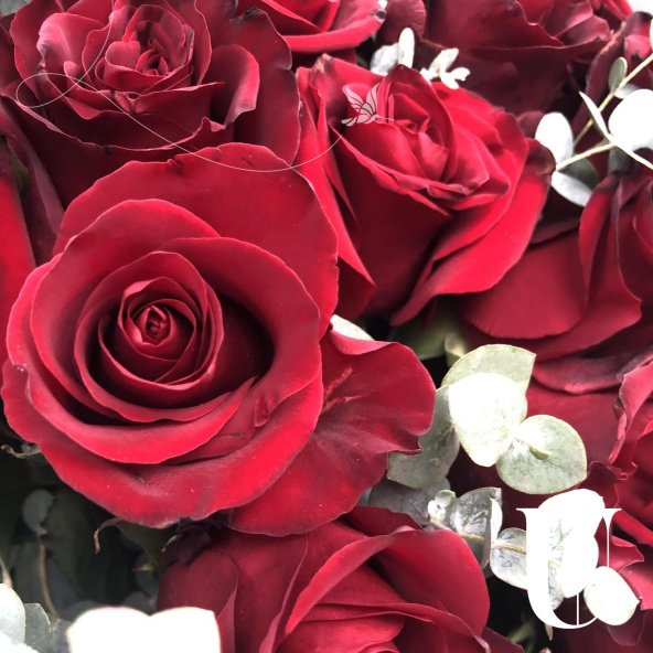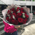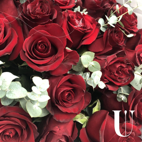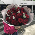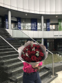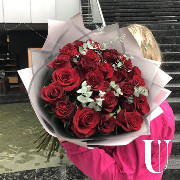 Монобукет из алых роз сорта Нина 60 см в упаковке