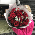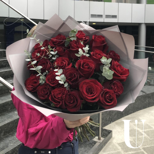 Букет из 21 гвоздики сорта Гермес в дизайнерской упаковке