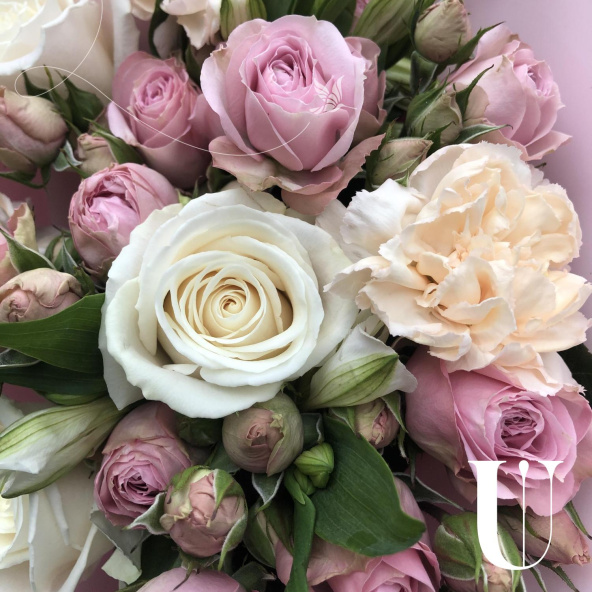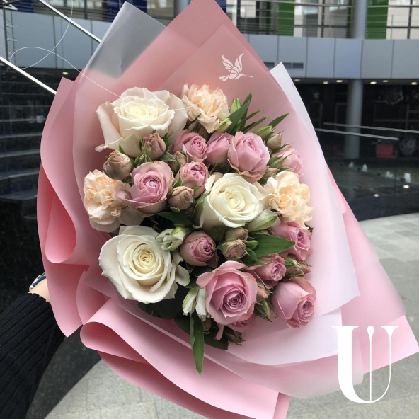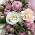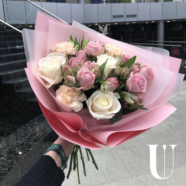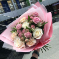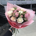 Монобукет из 7 роз сорта Капучино и эвкалипта в дизайнерской упаковке