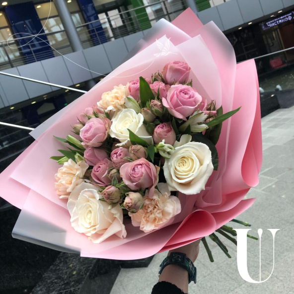 Сочный букет с французскими розами и красными альстромериями в упаковке