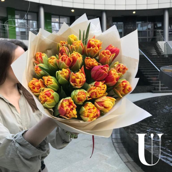 Букет из 21 гвоздики сорта Гермес в дизайнерской упаковке