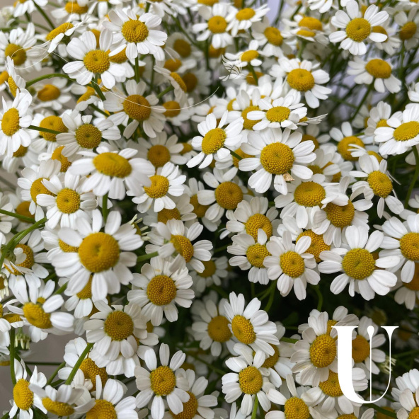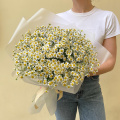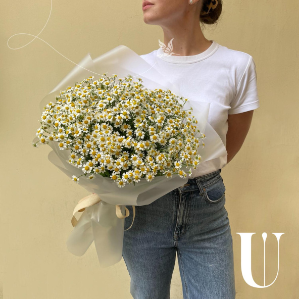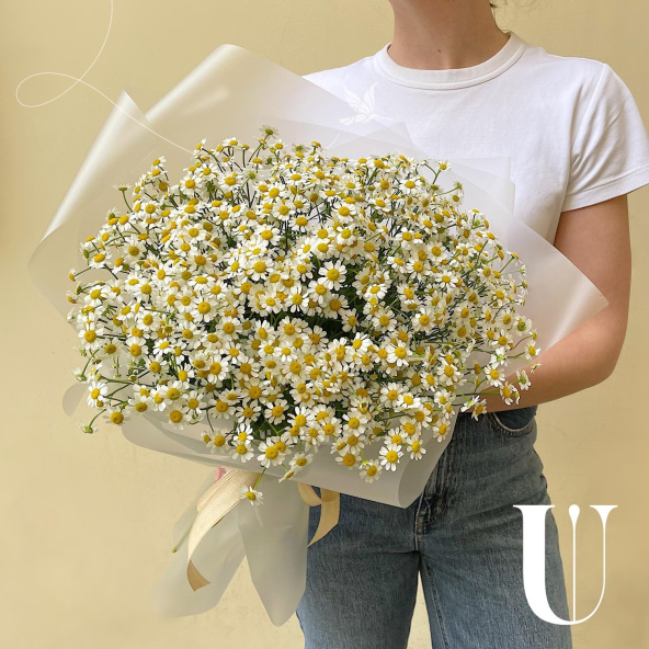 Монобукет из белых ирисов и ромашки в стильной упаковке