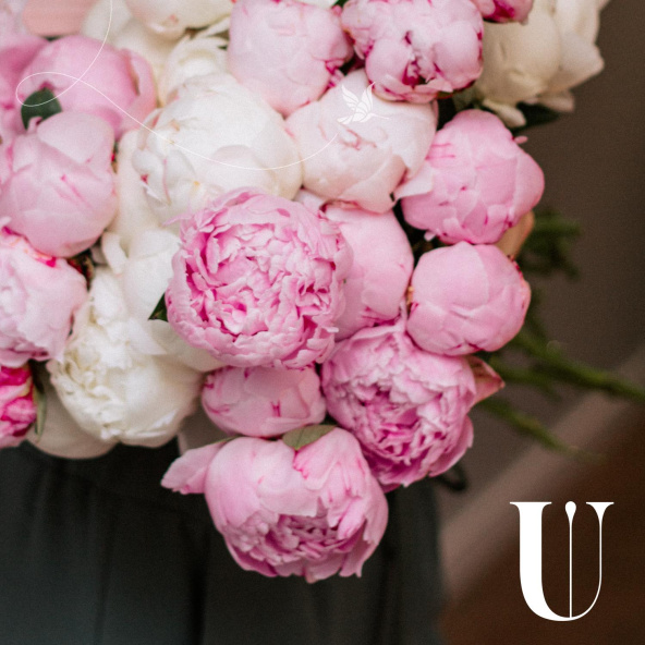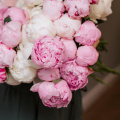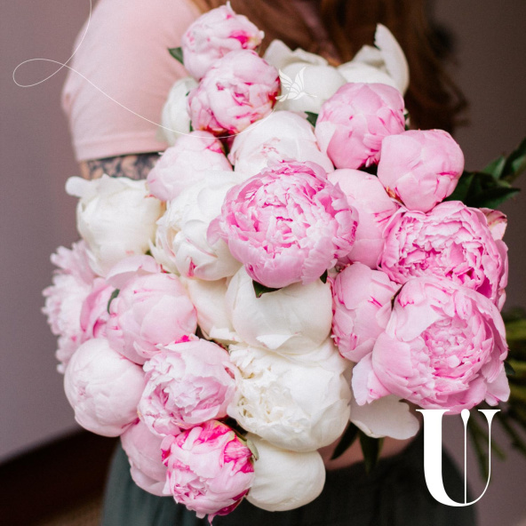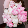 Монобукет из голубых и пурпурных гортензий в синей упаковке