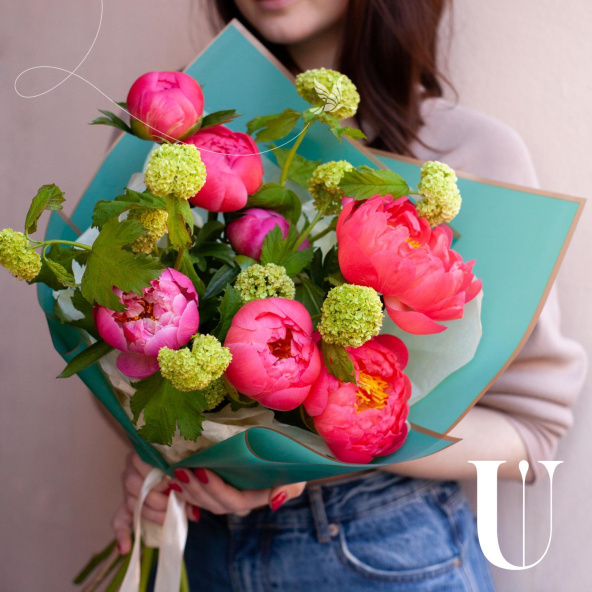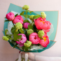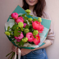 Букет из пионовидных роз Мандарнин Экспрешн и кустовых роз Джульетта в упаковке