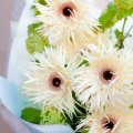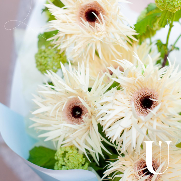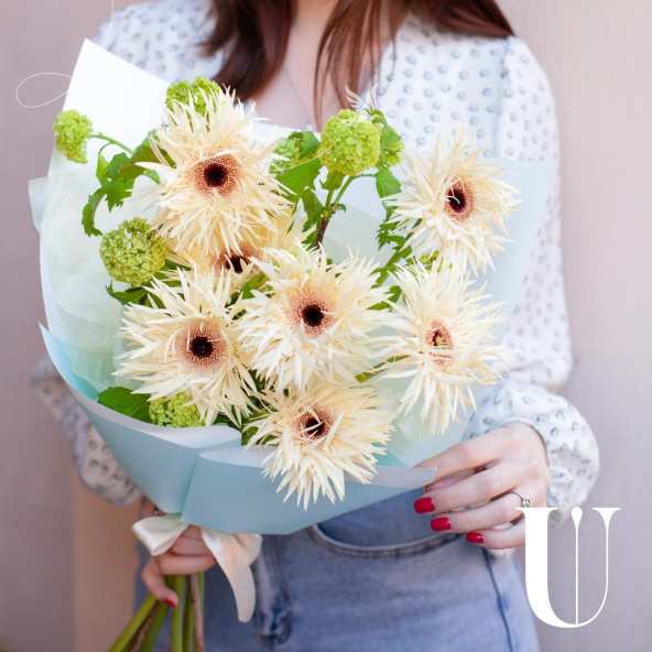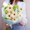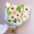Монобукет из 5 белых хризантем сорта Виена в белой упаковке