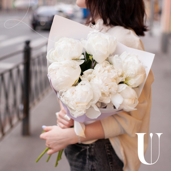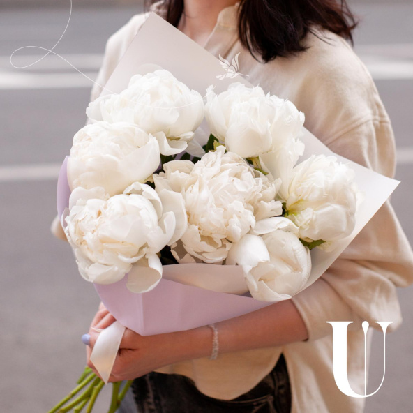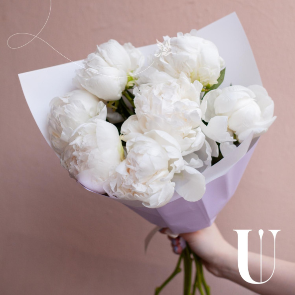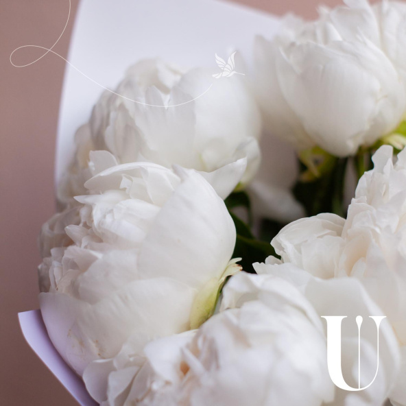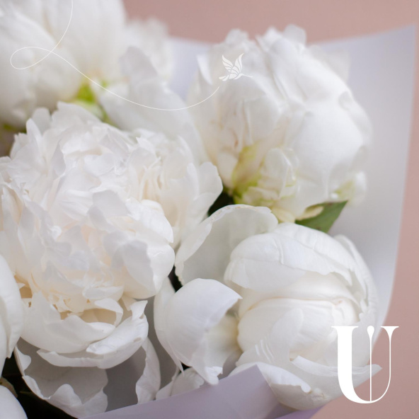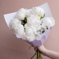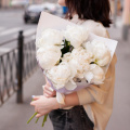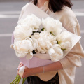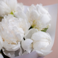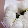 Монобукет из нежно-розовых кустовых пионовидных роз в белой упаковке