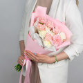 Монобукет из 5 роз сорта Вайт Охара и лимониума в упаковке