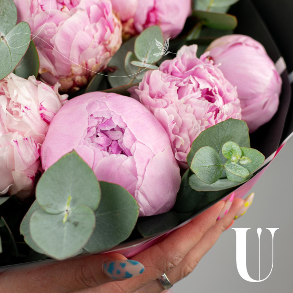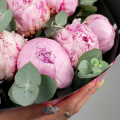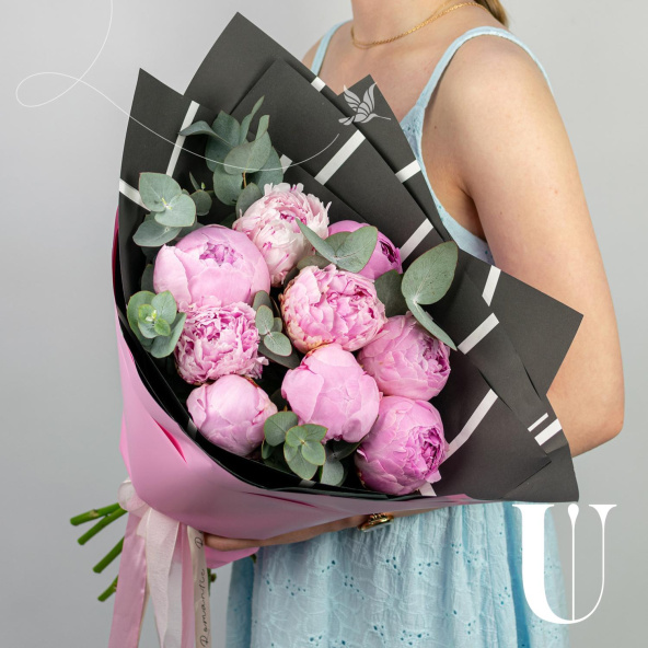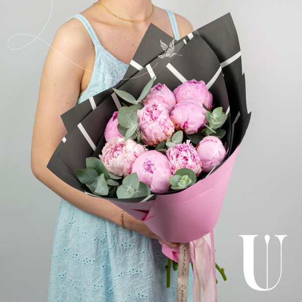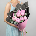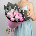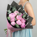 Монобукет из 15 розовых пионовидных роз в дизайнерской упаковке
