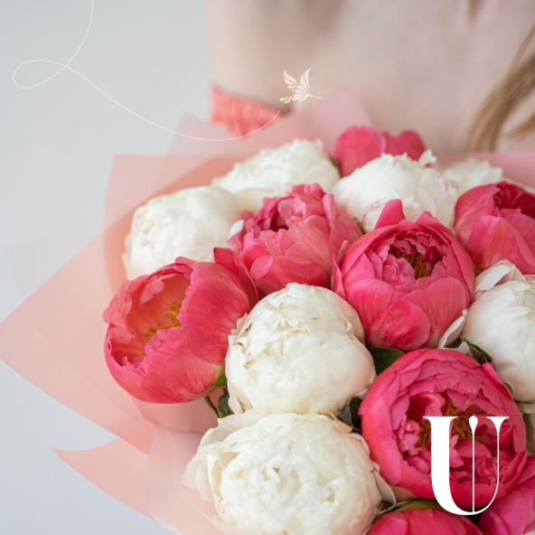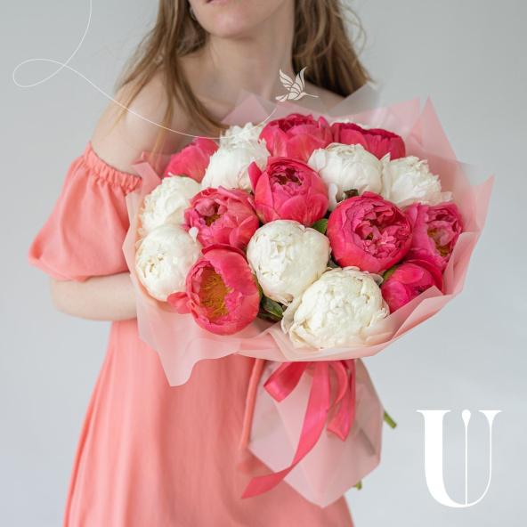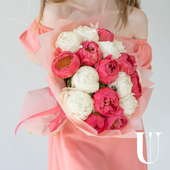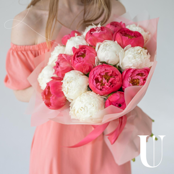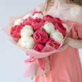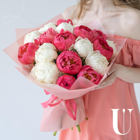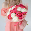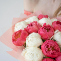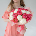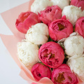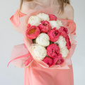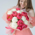 Стильный монобукет из 25 пионовидных роз Кахала в упаковке