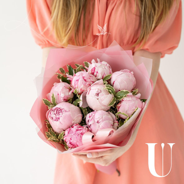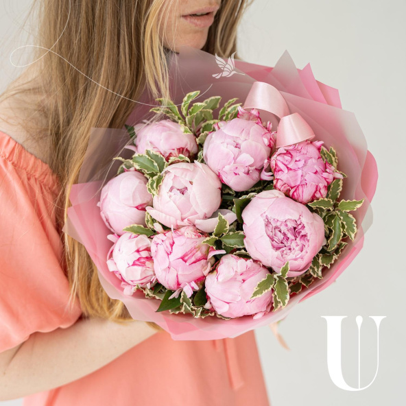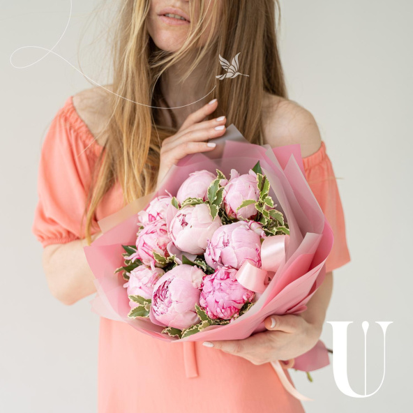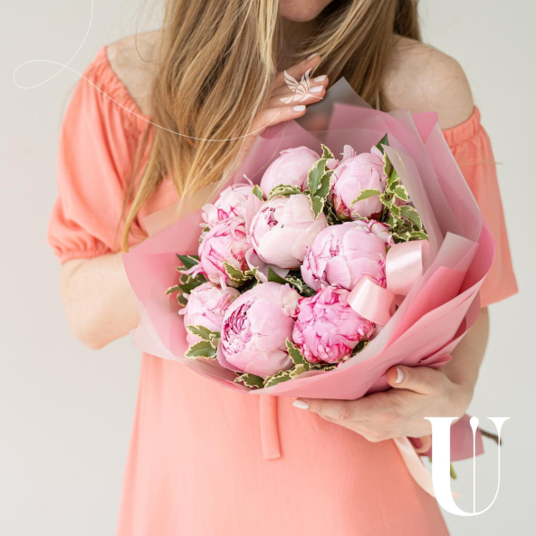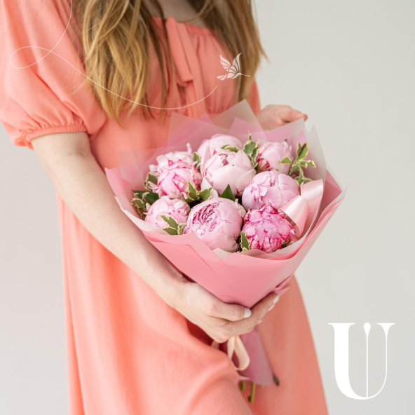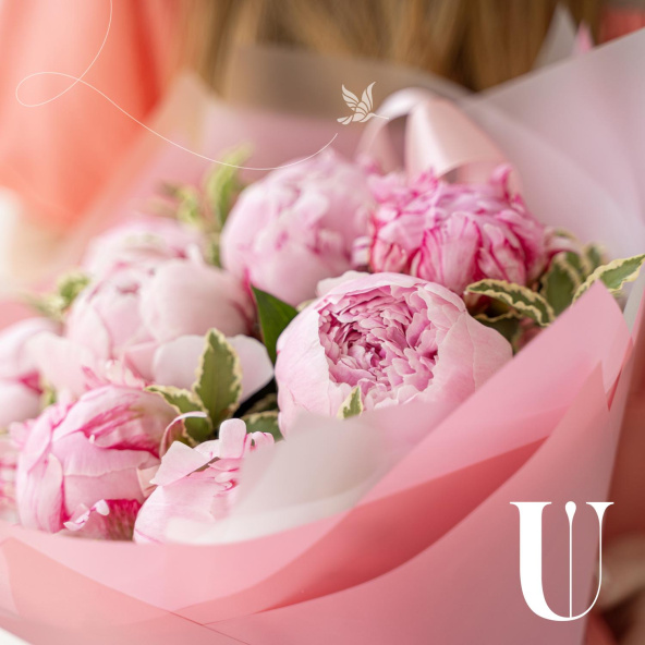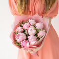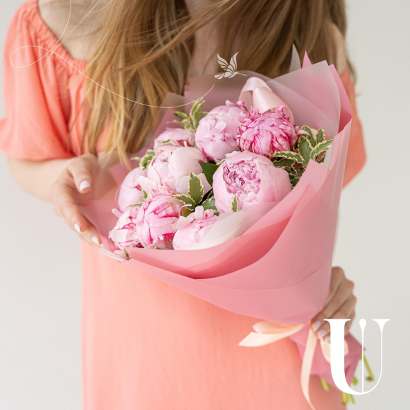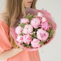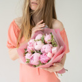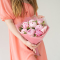 Монобукет из розовых кустовых пионовидных роз в дизайнерской упаковке