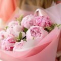 Монобукет из нежно-розовых кустовых пионовидных роз в белой упаковке