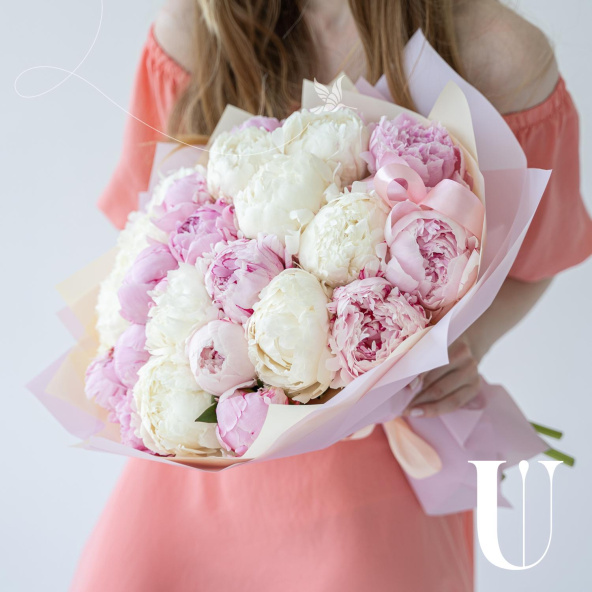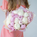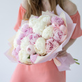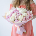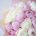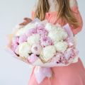 Монобукет из нежно-розовых и пудровых кустовых роз Бомбастик в дизайнерской упаковке