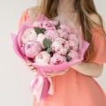 Монобукет из нежных и розовых кустовых роз в дизайнерской упаковке
