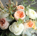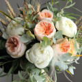 Нежный букет с английскими пионовидными розами, пионами и травами. Букет букет плотный и круглый, просматривается со всех сторон