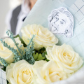 Монобукет из 5 роз сорта Вайт Охара и лимониума в упаковке