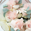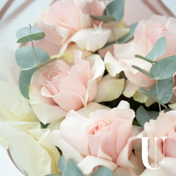 Монобукет из нежно-розовых кустовых пионовидных роз в белой упаковке